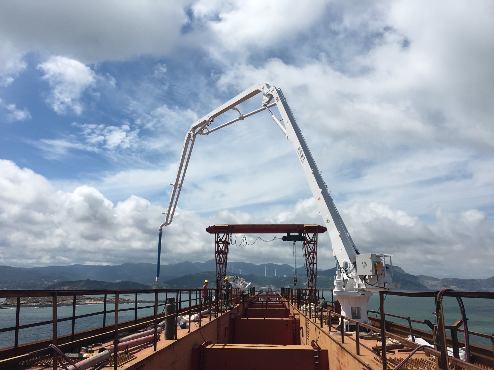 21米船上混凝土液壓布料機(jī)配置方案采用一體式進(jìn)行混凝土泵送,把布料機(jī)安裝在船的甲板上固定,船艙內(nèi)放置攪拌罐、拖泵進(jìn)行鏈接一條流水式泵送系統(tǒng),可以把混凝土運(yùn)輸?shù)绞┕?fù)雜以及跨海大橋橋墩位置進(jìn)行澆筑。