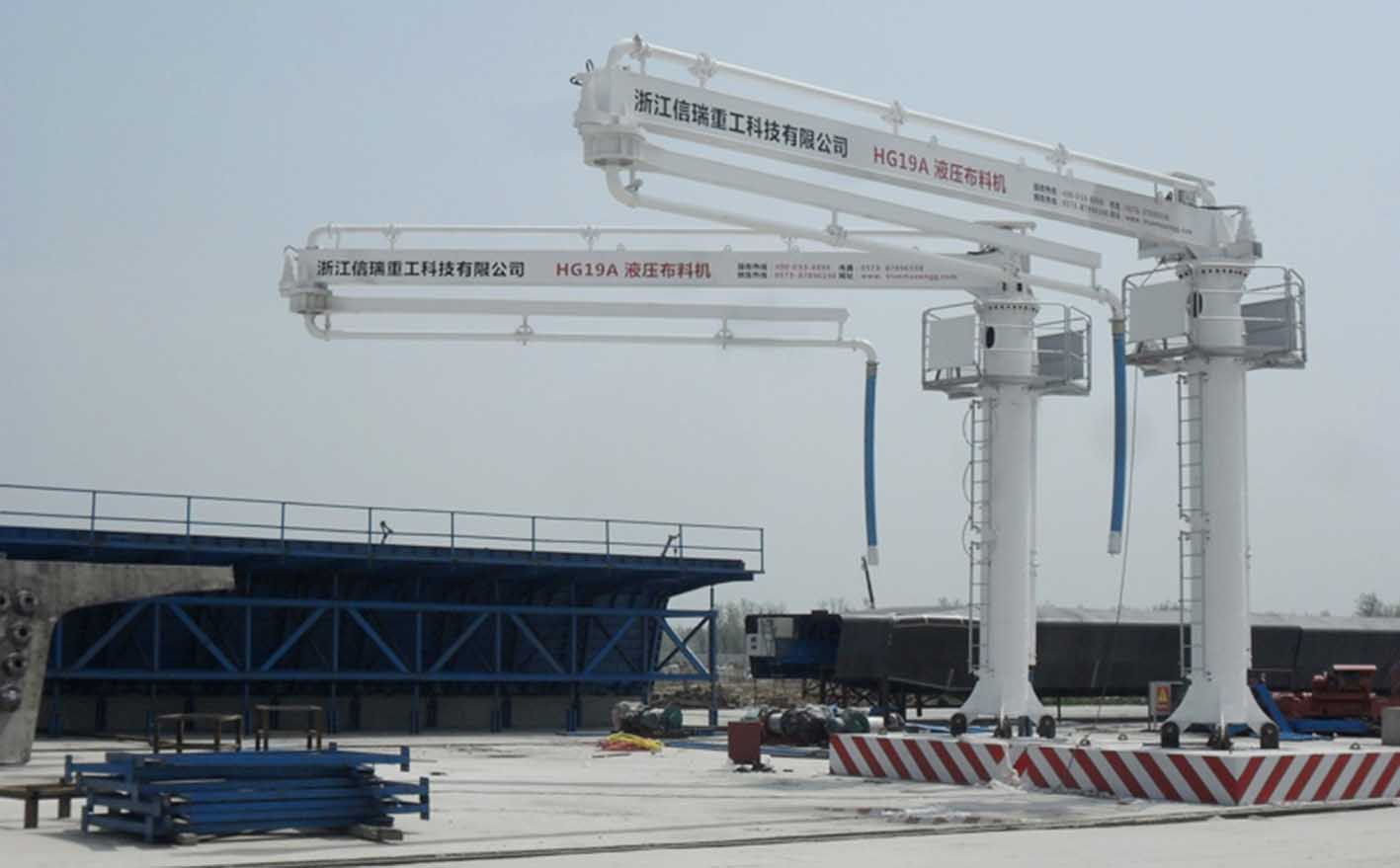 HG19AG固定式液壓布料機1.本產(chǎn)品為預(yù)制梁場專用布料機,臂架為輕量化設(shè)計,兩節(jié)臂水平旋轉(zhuǎn),全液壓驅(qū)動,結(jié)構(gòu)簡單,操作方便。2.圓柱式塔身,承載力強,晃動小,還配備平臺爬梯及欄桿,便于檢修設(shè)備保養(yǎng)。3.主要電氣、液壓元器件采用國內(nèi)外知名品牌,性能穩(wěn)定。4.基礎(chǔ)連接型式有預(yù)埋支腿式、預(yù)埋螺栓式等,并且可根據(jù)用戶工地的實際情況,非標(biāo)設(shè)計,滿足了用戶不同的需求。5.可移動式基礎(chǔ),可整機整體移位,無需拆